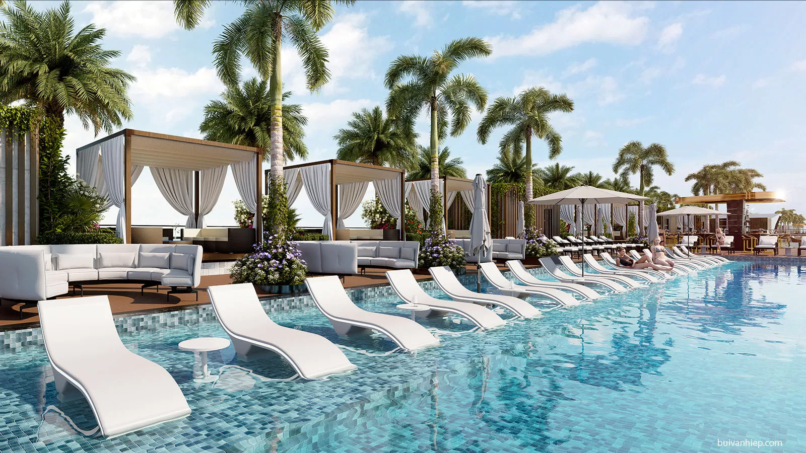 Không chỉ dừng lại ở trải nghiệm bơi lội thông thường, khu vực ôm sát trục hồ bơi được chủ đầu tư kiến tạo tựa như những Beach Club lừng danh tại Bali hay Maldives. Không gian nơi đây được “đo ni đóng giày” để phục vụ trọn vẹn nhu cầu tiệc tùng sành điệu và thư giãn cá nhân hóa đỉnh cao cho các chủ nhân tương lai.