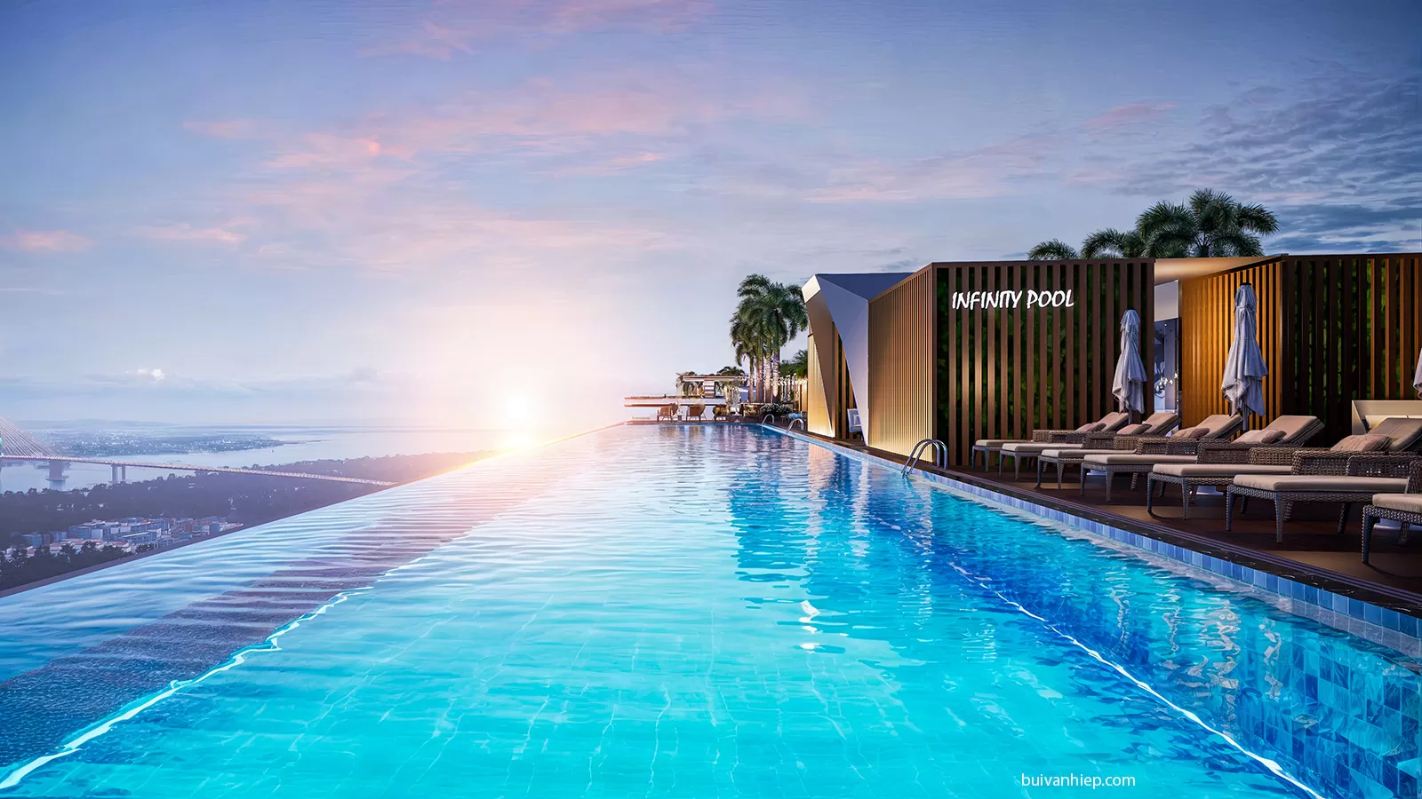 Hồ bơi vô cực & Bể tắm nắng Giải trí & Thư giãn Trải nghiệm bơi lội đỉnh cao với thiết kế tràn viền xóa nhòa ranh giới giữa mặt nước và bầu trời, kèm khu vực tắm nắng riêng tư.