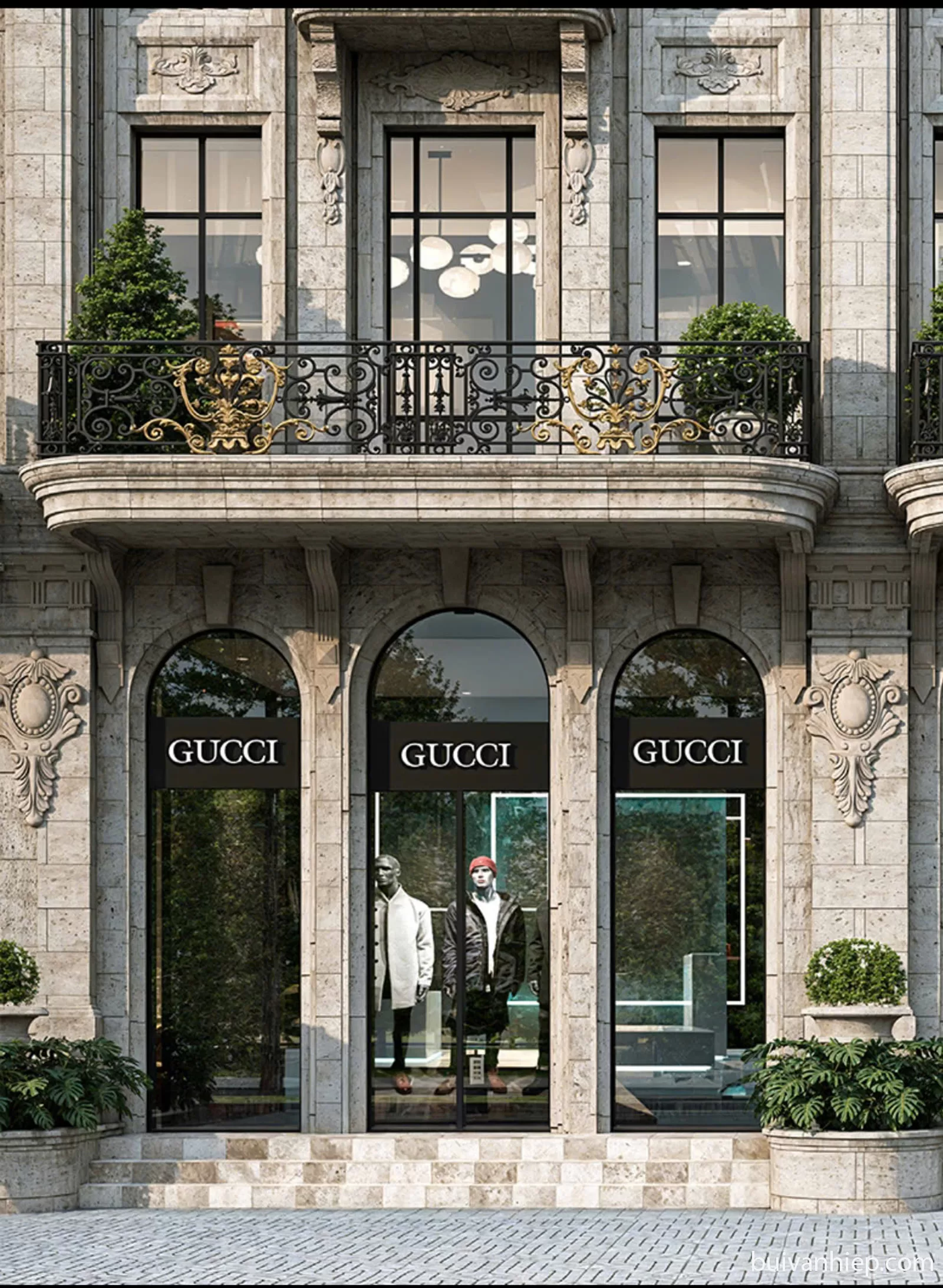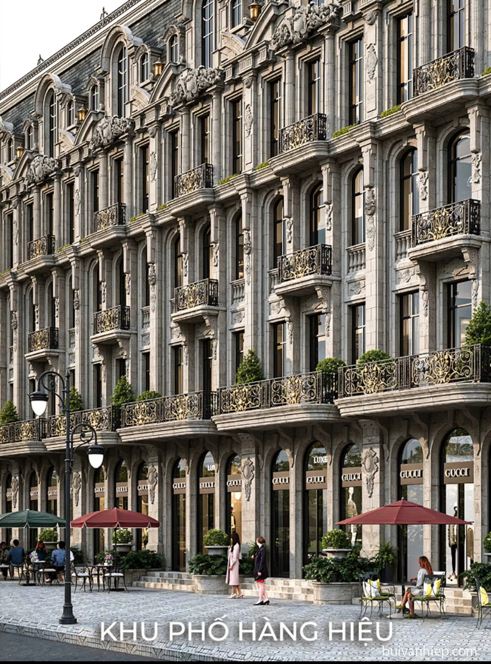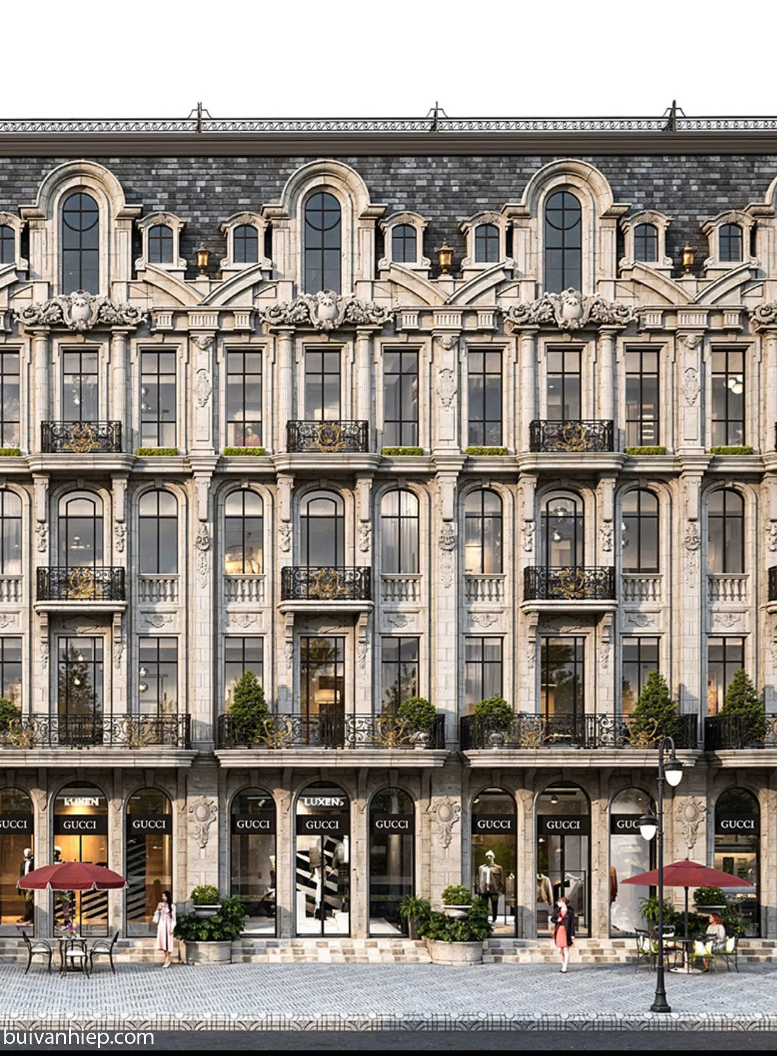 - Ngôn ngữ kiến trúc: Ghi dấu ấn mạnh mẽ với mặt đứng đối xứng, hàng cột xuyên tầng thanh thoát và hệ mái Mansard dốc nghiêng đặc trưng. Mặt tiền được điểm xuyết bởi hệ gờ phào chỉ đắp nổi công phu, ban công sắt rèn nghệ thuật và hệ cửa kính vòm cao rộng, kiến tạo nên diện mạo sang trọng vượt thời gian cho phân khu The Boutique Mansion.